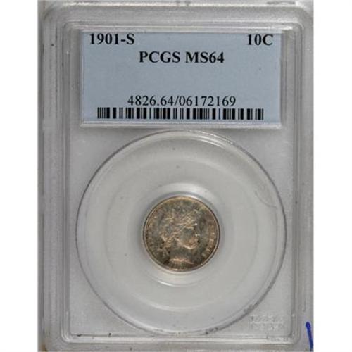 <B>1901-S 10C MS64 PCGS.</B></I> Less than 600,000 pieces were struck of this challenging branch mint issue. The currently offered near-Gem is sharply struck with a bright, satiny appearance and extensive speckled red-brown patina over otherwise silver-gray surfaces. Careful study with a loupe locates a few tiny marks on the portrait. One of the scarcest Barber dime issues in any Uncirculated grade. Population: 9 in 64, 18 finer (9/07).<BR><BR><B>Coin Engraver:</B> Charles E. Barber<BR><BR><b>Shipping:</b> Coins & Currency (<a target="_blank" href="http://www.heritageauctions.com/common/shipping.php">view shipping information</a>)