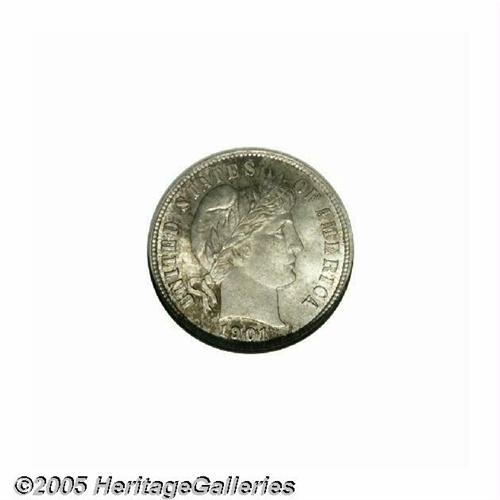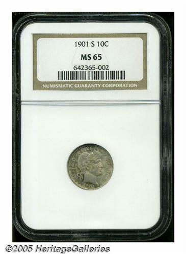 <B>1901-S<10C> MS65 NGC.</B></I> Sharply struck and highly lustrous with frosty obverse and reverse surfaces. The obverse has attractive ivory color with splashes of darker golden-brown toning. The reverse is slightly lighter in appearance. This is a lovely example, and elusive in Gem quality. In fact, NGC has only certified 12 examples better than MS65.