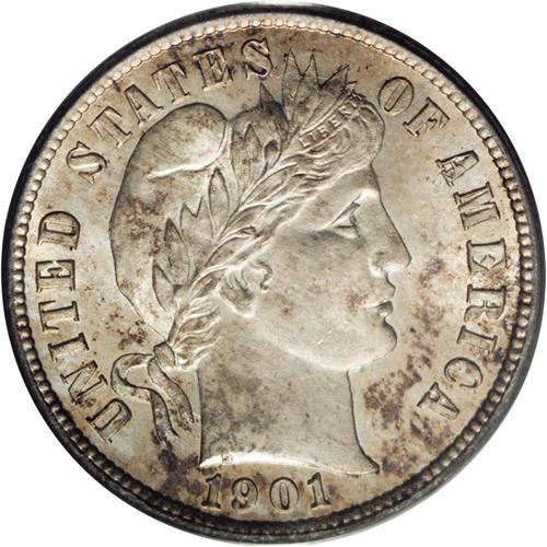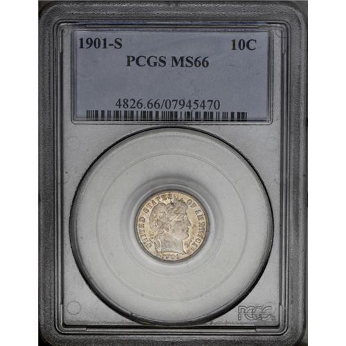 <B>1901-S<10C> MS66 PCGS.</B></I> Among the general series of Barber dimes (not including the 1894-S), this is one of the rarities with Gem Mint State examples seldom encountered. It is not as rare or valuable as the similarly dated Barber quarter, but the mintage of this small silver issue was limited to just 593,022 coins, suggesting its elusive nature. This one has frosty silver luster with ivory hues that are complemented by splashes of golden-brown color. The surfaces are exceptional with only a few tiny abrasions on each side. Population: 5 in 66, 4 finer (3/06).
