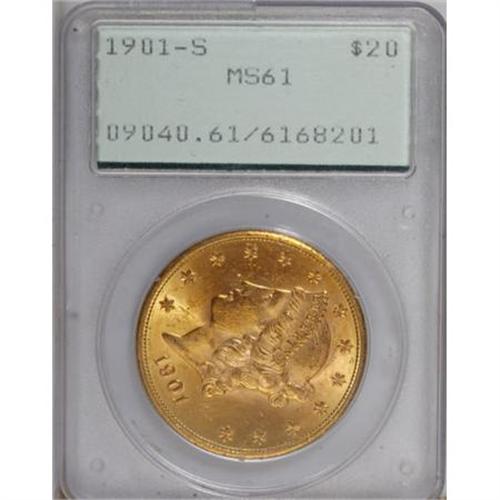 <B>1901-S $20 MS61 PCGS.</B></I> PCGS Population (424/1097). NGC Census: (821/1030). Mintage: 1,596,000. Numismedia Wsl. Price for NGC/PCGS coin in MS61: $705. (#9040)<BR><BR><B>Coin Engraver:</B> James B. Longacre<BR><BR><b>Shipping:</b> Coins & Currency (<a target="_blank" href="http://www.heritageauctions.com/common/shipping.php">view shipping information</a>)