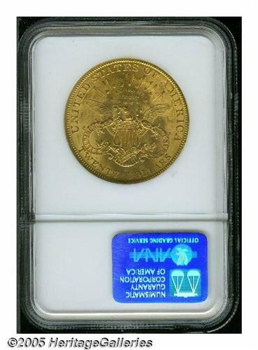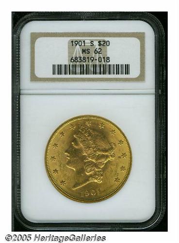 <B>1901-S<$20> MS62 NGC.</B></I> This San Francisco Double Eagle offers booming luster and a generally sharp strike. A small bagmark is noted between stars 5 and 6 .