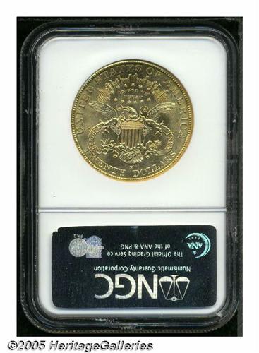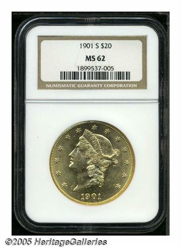 <B>1901-S<$20> MS62 NGC.</B></I> Well struck with resplendent, exceedingly frosty surfaces, beautiful peach-gold coloration, and numerous small abrasions and luster grazes that limit the grade.