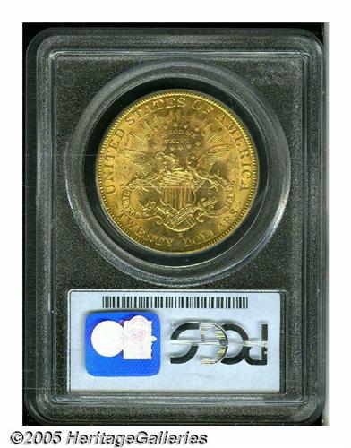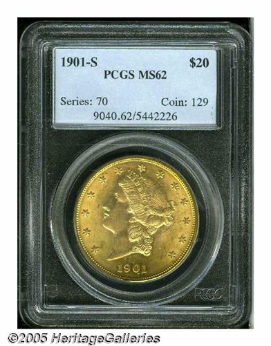 <B>1901-S<$20> MS62 PCGS.</B></I> Bright and lustrous, with a flashy, richly toned appearance and sparkling, satiny surfaces. Glamorous cartwheel luster rolls around the obverse fields, as the piece is rotated beneath a lamp. The grade is determined by the number of small contact marks that are peppered over both sides of the piece.