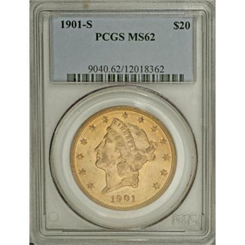 <B>1901-S $20 MS62 PCGS.</B></I> Boldly impressed central devices and strongly lustrous yellow-gold and sun-gold surfaces. Despite a number of light abrasions, this S-mint twenty offers a pleasing appearance.<BR><I>From The York/Hallenbeck #2 Current Finest PCGS Registry Set of Liberty Double Eagles.</B></I><BR><BR><B>Coin Engraver:</B> James B. Longacre<BR><BR><b>Shipping:</b> Coins & Currency (<a target="_blank" href="http://www.heritageauctions.com/common/shipping.php">view shipping information</a>)