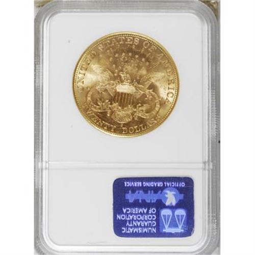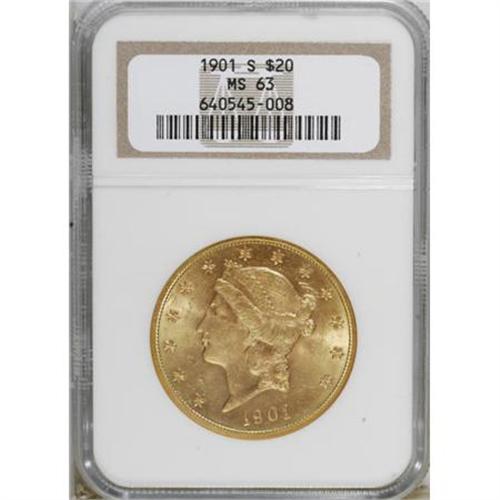 <B>1901-S $20 MS63 NGC.</B></I> Lovely peach patina adorns this lustrous and boldly impressed Liberty gold type coin. As expected of the Select grade, the obverse field has distributed minor marks, but the portrait is generally smooth, and the reverse is surprisingly clean. A number of 1901-S twenties have returned from foreign bank holdings in recent decades, but most are thoroughly abraded, unlike the present piece.<BR><BR><B>Coin Engraver:</B> James B. Longacre<BR><BR><b>Shipping:</b> Coins & Currency (<a target="_blank" href="http://www.heritageauctions.com/common/shipping.php">view shipping information</a>)