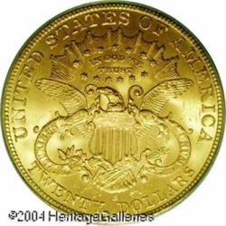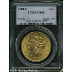 1901-S $20 MS63 PCGS. A delightful Twenty that has <B>1901-S $20 MS63 PCGS.</B></I> A delightful Twenty that has a lot more eye appeal than its grade might indicate. The green-gold luster is full and the strike well detailed. The grade is a technical reflection of the number of small marks found mainly on the obverse, none of which are notable. <BR><BR><B>Important notice:</B> Heritage usually auctions material at the rate of 200-250 lots per hour. On some occasions eBay Live bid software or the Internet may not be able to keep up with the pace of the auction. We recommend placing a realistic absentee bid now as insurance to avoid disappointment. Occasionally the auctioneer may eliminate or reject an eBay Live bid, and the auctioneer may also reopen a lot after the close of the eBay live bidding (usually because we missed an audience bid), and may reject your bid even if it shows you as the winning bidder. By bidding via eBay Live, you agree that Heritage may award the lot to another bidder at its sole discretion under the circumstances described above or any other reasonable circumstances. Since eBay bids are not shown to us until we open the lot on the floor, we treat those bids just like floor bids. In most cases the floor responds before the eBay bid is presented to us, due to Internet lag time, so for consistency we have made it a policy that floor bids are always considered first over tie eBay live bids. Also please note that all Heritage lots purchased through eBay Live carry a 20% Buyer's Premium. Please make sure you read the Terms and Conditions before you bid. This lot is being auctioned in conjunction with a live floor auction by Heritage Galleries & Auctioneers. All final auction and invoice information will be supplied by Heritage Galleries & Auctioneers, and all other information should be considered preliminary. Lot:7016