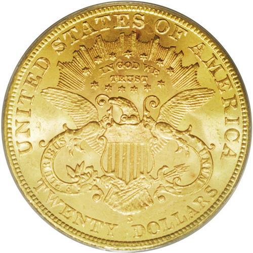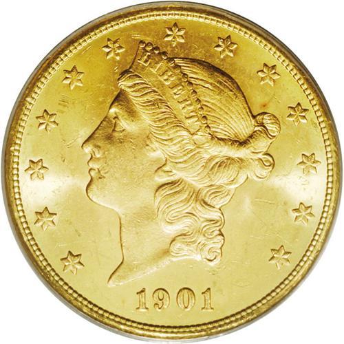 <B>1901-S<$20> MS63 PCGS.</B></I> Apricot-tinged centers are bounded by olive-gold hues near the rims. This crisply struck representative has a well preserved reverse, and the obverse has only the expected number of tiny marks. Theodore Roosevelt ascended to the Presidency in 1901, an event that eventually led to the redesign of all circulating gold types.