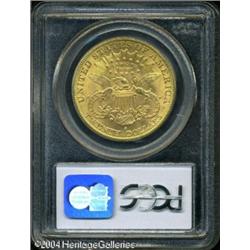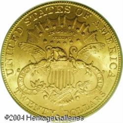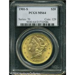 1901-S $20 MS64 PCGS. The '01-S has a respectable <B>1901-S $20 MS64 PCGS.</B></I> The '01-S has a respectable original mintage of 1.6 million pieces. While readily obtainable in grades up to and including MS62, it is a challenging coin to locate at or above the Select BU level of preservation. The few small hoards of 1901-S Double Eagles that entered the numismatic market over the past several years included coins that, on average, grade no finer than MS61. The present representative, on the other hand, is free of all but a few distractions over the central obverse. The design elements are sharply detailed, and both sides are awash in scintillating satiny luster. Originally preserved with dominant green-gold color and whispers of pale rose toward the centers. Population: 66 in 64, 2 finer (10/04). <BR><BR><B>Important notice:</B> Heritage usually auctions material at the rate of 200-250 lots per hour. On some occasions eBay Live bid software or the Internet may not be able to keep up with the pace of the auction. We recommend placing a realistic absentee bid now as insurance to avoid disappointment. Occasionally the auctioneer may eliminate or reject an eBay Live bid, and the auctioneer may also reopen a lot after the close of the eBay live bidding (usually because we missed an audience bid), and may reject your bid even if it shows you as the winning bidder. By bidding via eBay Live, you agree that Heritage may award the lot to another bidder at its sole discretion under the circumstances described above or any other reasonable circumstances. Since eBay bids are not shown to us until we open the lot on the floor, we treat those bids just like floor bids. In most cases the floor responds before the eBay bid is presented to us, due to Internet lag time, so for consistency we have made it a policy that floor bids are always considered first over tie eBay live bids. Also please note that all Heritage lots purchased through eBay Live carry a 20% Buyer's Premium. Please make sure you read the Terms and Conditions before you bid. This lot is being auctioned in conjunction with a live floor auction by Heritage Galleries & Auctioneers. All final auction and invoice information will be supplied by Heritage Galleries & Auctioneers, and all other information should be considered preliminary. Lot:7018