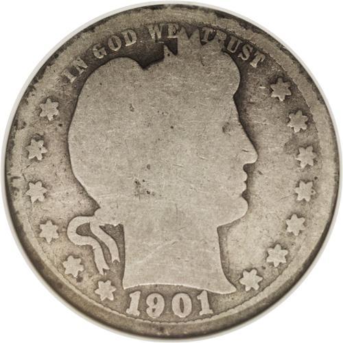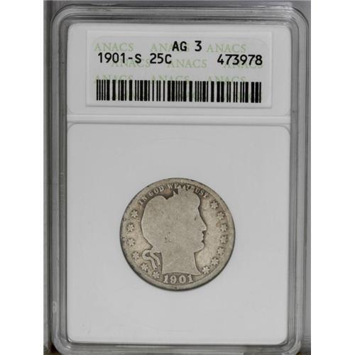 <B>1901-S<25C> AG3 ANACS.</B></I> Light silver surfaces with splashes of darker toning on both sides. The obverse of this example has full rims and completely outlined design elements, including a full date. The reverse has only a few peripheral letters visible, but a fully formed mintmark.