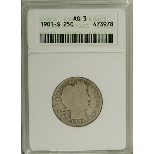 <B>1901-S 25C AG3 ANACS.</B></I> The obverse stars and legends are distinct from the rim, as is the mintmark. About three-quarters of the reverse peripheral legends blend into the border, and four letters in E PLURIBUS UNUM are readable. A well-worn but problem-free example of this coveted series key.<BR><BR><b>Shipping:</b> Coin/Currency (<a target="_blank" href="http://www.heritageauctions.com/common/shipping.php">view shipping information</a>)