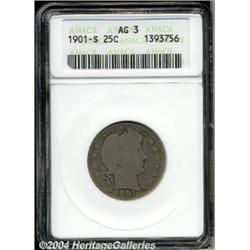 <B>1901-S<25C> AG3 ANACS.</B></I> A solid About Good example of this 20th century rarity that has an original mintage of just 72,664 pieces and a low survivorship. Most of the central devices are clearly outlined, with part of Liberty's eye and ear showing. The obverse has a strong date and legend, essentially complete stars, and a nearly full rim, while the reverse exhibits complete stars, a fairly clear mintmark, and the peripheral legends partly worn into the rim, though UNITED is nearly full. The surfaces are light-gray in color and relatively clean for the grade, revealing only a few old, unobtrusive pinscratches, mostly in the fields, and barely noticeable wispy slide marks on the central devices. The '01-S quarter is a highly desirable issue in any grade. This example will fit nicely into a low-grade Barber quarter set.<BR><I>From The Paulsboro Collection, Part Two.</B></I> <BR><BR><B>Important notice:</B> Heritage usually auctions material at the rate of 200-250 lots per hour. On some occasions eBay Live bid software or the Internet may not be able to keep up with the pace of the auction. We recommend placing a realistic absentee bid now as insurance to avoid disappointment. Occasionally the auctioneer may eliminate or reject an eBay Live bid, and the auctioneer may also reopen a lot after the close of the eBay live bidding (usually because we missed an audience bid), and may reject your bid even if it shows you as the winning bidder. By bidding via eBay Live, you agree that Heritage may award the lot to another bidder at its sole discretion under the circumstances described above or any other reasonable circumstances. Since eBay bids are not shown to us until we open the lot on the floor, we treat those bids just like floor bids. In most cases the floor responds before the eBay bid is presented to us, due to Internet lag time, so for consistency we have made it a policy that floor bids are always considered first over tie eBay live bids. Also please note that all Heritage lots purchased through eBay Live carry a 20% Buyer's Premium. Please make sure you read the Terms and Conditions before you bid. </span></font></tr></table></td></tr></table>