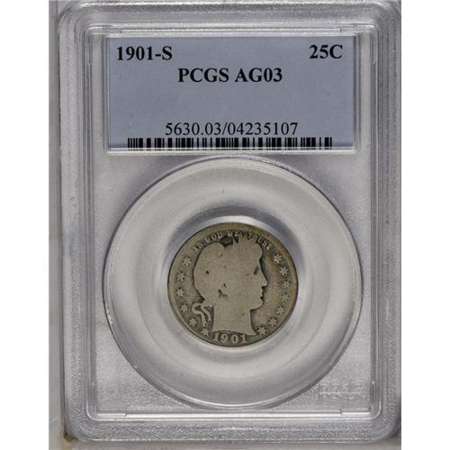 <B>1901-S<25C> AG3 PCGS.</B></I> An original, uncleaned coin. Heavily worn into the rim on the reverse, however the date and mintmark are still clearly defined. An affordable alternative for this key date.