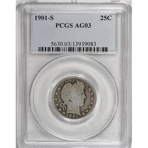 <B>1901-S 25C AG3 PCGS.</B></I> The 1901-S is usually only found in AG-Good condition with the occasional VG seen. This is a truly rare issue, struck a few years before the general public became aware of the significance of low mintages. Evenly worn overall, the fields are deep gray with brightly contrasting, nearly brilliant rub over the highpoints.<BR><BR><B>Coin Engraver:</B> Charles E. Barber<BR><BR><b>Shipping:</b> Coins & Currency (<a target="_blank" href="http://www.heritageauctions.com/common/shipping.php">view shipping information</a>)