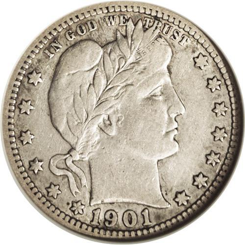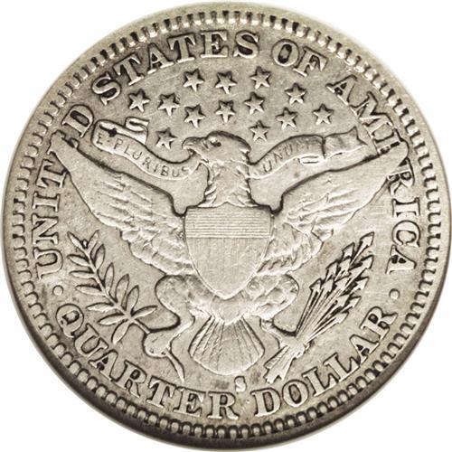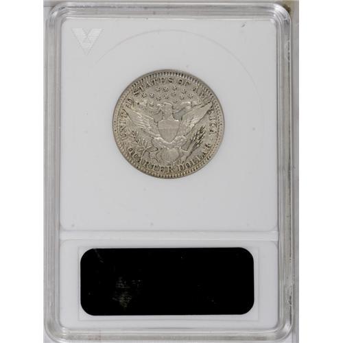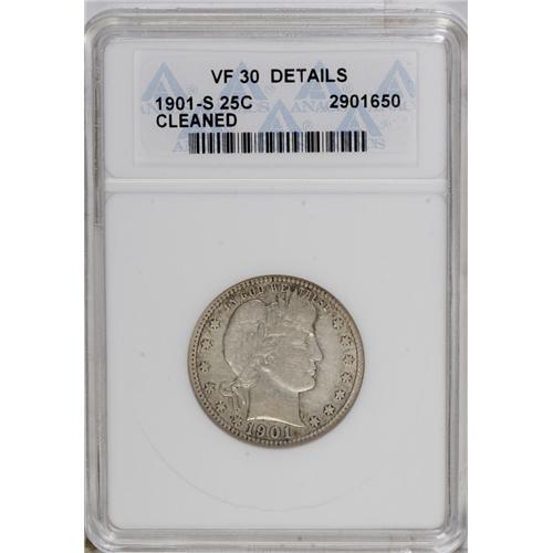 <B>1901-S<25C>--Cleaned--ANACS. VF30 Details.</B></I> The vast majority of 1901-S quarters are in AG-VG grades, and coins in Fine and better are rarely encountered. This is for three reasons. First, the low original mintage. Second, apparently the 72,664 coins that were struck were almost all dropped into circulation and stayed there. Third, the few mid-grade coins that are known are tightly held in collections of Barber quarters. The rarity of this issue has encouraged the ungodly (as Breen phrased it) to take advantage of the unwary. Only two sets of dies were used for the 1901-S. This coin is from the second set with Obverse B and Reverse B. This die pairing is characterized by both 1s in the date centered between denticles, and on the reverse by the position of the mintmark above the tops of the R and D.<BR> This is a well-defined piece that shows noticeable wear only on the front of Liberty's hair and on the tips of the eagle's wings. Obviously cleaned, as indicated on the ANACS insert, the surfaces are free from any mentionable blemishes. A light ring of golden toning encircles the margins on each side.