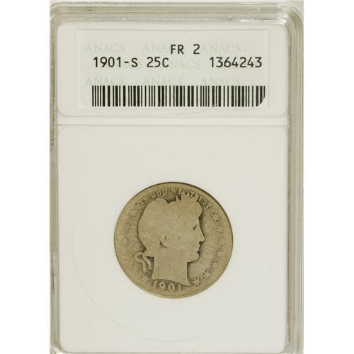 <B>1901-S 25C Fair 2 ANACS.</B></I> The date and mintmark are clear, as is IN GOD WE TRUST, while the obverse stars are somewhat faint and the reverse peripheral legends are about half worn into the rim. Two letters in E PLURIBUS UNUM are legible. Mostly pearl-gray with charcoal toning in the open fields. The key date of the series, since fewer were saved than the even lower mintage 1913-S.<BR><BR><b>Shipping:</b> Coins & Currency (<a target="_blank" href="http://www.heritageauctions.com/common/shipping.php">view shipping information</a>)