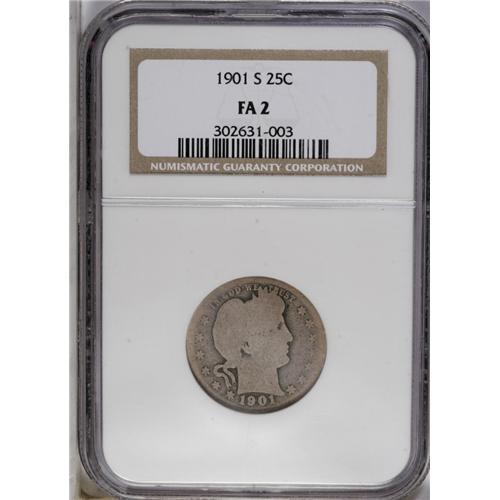 <B>1901-S<25C> Fair 2 NGC.</B></I> The 1901-S quarter has an impressively low mintage of only 72,664 pieces. This issue was struck before collectors and the general public were generally aware that a mintage this low was worth setting aside. As a result, almost the entire mintage slipped into circulation and today the vast majority of survivors grade no better than VG. This piece is heavily worn, as one would expect from the grade, but the surfaces are uncleaned and original. Most of each side displays light rose coloration with charcoal-gray surrounding the devices.