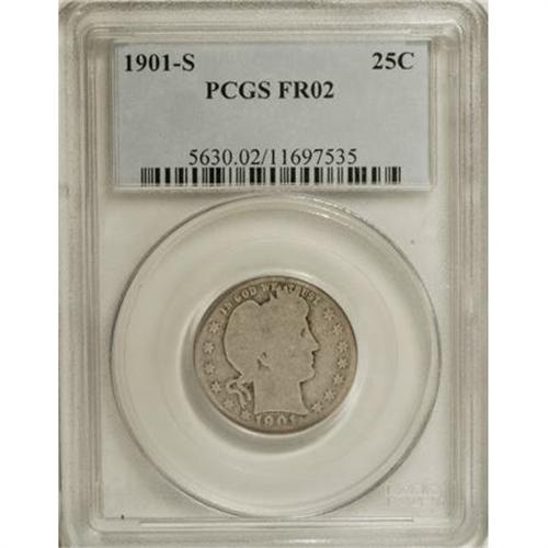 <B>1901-S 25C Fair 2 PCGS.</B></I> On its own, the obverse grades Good, since the date, IN GOD WE TRUST, and the obverse stars are all distinct. UNITED STATES OF is worn smooth, but AMERICA, QUARTER, and DOLLAR range from one-third to two-thirds legible. The mintmark is filled but fully outlined. The key to the Barber quarter series.<BR><BR><b>Shipping:</b> Coins & Currency (<a target="_blank" href="http://www.heritageauctions.com/common/shipping.php">view shipping information</a>)