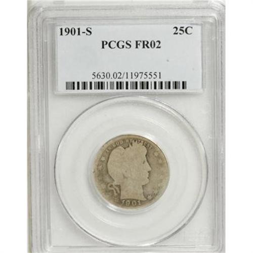 <B>1901-S 25C Fair 2 PCGS.</B></I> Natural light gray surfaces with some areas of darker patina on each side of this well worn 1901-S quarter. The obverse has nearly full rims with a sharp date and motto. Every obverse star is visible although a few are weak. The reverse has only a few letters partially visible, but has full central details with a bold mintmark.<BR><I>From The John Stimson, Sr. Collection, Part Two.</B></I><BR><BR><B>Coin Engraver:</B> Charles E. Barber<BR><BR><b>Shipping:</b> Coins & Currency (<a target="_blank" href="http://www.heritageauctions.com/common/shipping.php">view shipping information</a>)
