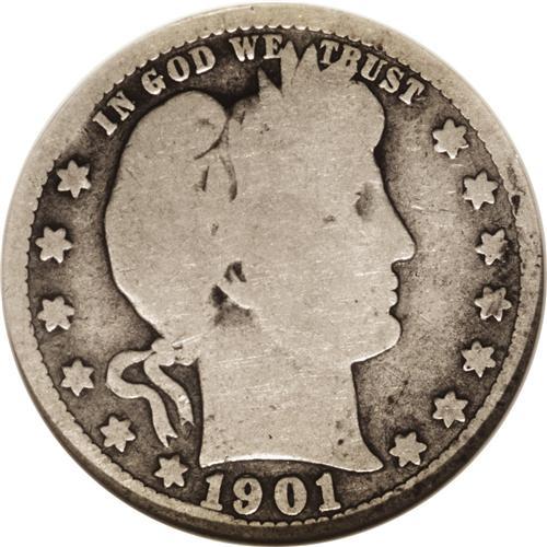 <B>1901-S<25C> Good 4 NGC.</B></I> A clean, problem-free example of this rare issue. The recessed areas of the design have taken on deep, charcoal-gray patina while the highpoints are untoned. A full rim is seen on the obverse, the border on the reverse is worn into some of the letters of the legend. A rare, highly collectible example.
