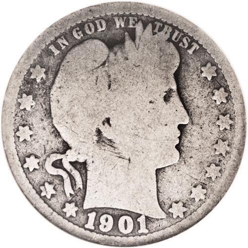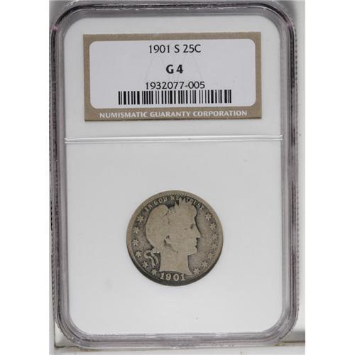 <B>1901-S 25C Good 4 NGC.</B></I> A well worn and attractive Good 4 example of this important key date. Liberty's wreath details are worn away, and some of the reverse rim detail is missing. Several pinscratches cross the obverse and reverse central devices, but these are faint and essentially non-distracting.<BR><BR><b>Shipping:</b> Coin/Currency (<a target="_blank" href="http://www.heritageauctions.com/common/shipping.php">view shipping information</a>)