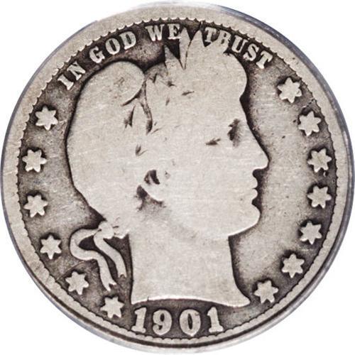 <B>1901-S<25C> Good 4 PCGS.</B></I> Light to medium gray with full, bold rims on the obverse and only occasional mushiness at the reverse border. The scarcity of this low mintage Barber issue was not recognized until decades after its release and most survivors fall under the Fair to About Good grade range.