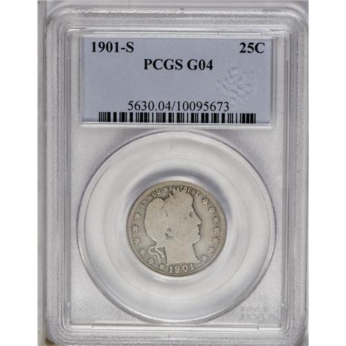 <B>1901-S<25C> Good 4 PCGS.</B></I> This is a lovely example for the grade with light gray surfaces and the usual insignificant abrasions that are consistent with a coin of this quality. The obverse has full borders, and the reverse has the border merged only with the very tops of some letters.