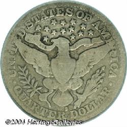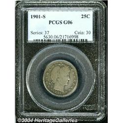 <B>1901-S<25C> Good 6 PCGS.</B></I> With its low mintage and even lower survival rate, the '01-S is the undisputed key of the Barber Quarter series and is highly sought after in all grades. This is an original piece that has light steel-gray surfaces that show deeper charcoal-gray accents around the devices. <BR><BR><B>Important notice:</B> Heritage usually auctions material at the rate of 200-250 lots per hour. On some occasions eBay Live bid software or the Internet may not be able to keep up with the pace of the auction. We recommend placing a realistic absentee bid now as insurance to avoid disappointment. Occasionally the auctioneer may eliminate or reject an eBay Live bid, and the auctioneer may also reopen a lot after the close of the eBay live bidding (usually because we missed an audience bid), and may reject your bid even if it shows you as the winning bidder. By bidding via eBay Live, you agree that Heritage may award the lot to another bidder at its sole discretion under the circumstances described above or any other reasonable circumstances. Since eBay bids are not shown to us until we open the lot on the floor, we treat those bids just like floor bids. In most cases the floor responds before the eBay bid is presented to us, due to Internet lag time, so for consistency we have made it a policy that floor bids are always considered first over tie eBay live bids. Also please note that all Heritage lots purchased through eBay Live carry a 20% Buyer's Premium. Please make sure you read the Terms and Conditions before you bid.