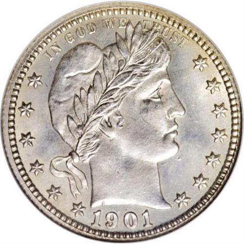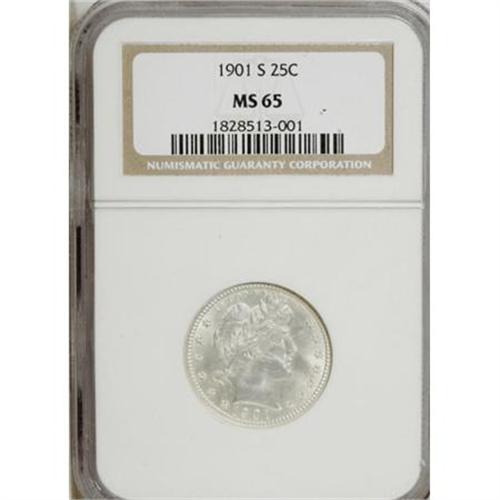 <B>1901-S 25C MS65 NGC.</B></I> Chief Engraver Charles Barber designed four denominations of circulating coins, the nickel through the half dollar. Most issues from his designs have mintages above 1 million pieces, yet every Barber series has one legendary rarity. The Liberty nickel boasts the 1913, of which only five examples are known. The great rarity of the Barber dime series is the 1894-S, with nine known survivors. A Barber half collection is stopped by the 1892-O Micro O, a formidable rarity in any grade. But some half dollar collectors manage to convince themselves it that it can be excluded from a date and mintmark collection. Thus, the 1892-O Micro O is valued less than the 1901-S quarter, which Barber specialist David Lawrence referred to as "the king of all Barber coinage."<BR> The mintage of the 1901-S is remarkably low. Only 72,664 pieces were struck. This is contrast to the 1900-S and 1902-S productions, which each exceeded 1.5 million pieces. Among the Barber issues struck for circulation, only the 1913-S quarter has a lesser mintage. But the 1913-S was saved to a greater extent, perhaps due to a growth in the number of West Coast collectors between 1901 and 1913, or perhaps due to dealer Wayte Raymond, who was known to hoard high grade examples of current issues.<BR> The 1901-S quarter is desirable regardless of grade. A Fair 2 example brought $2,070 in our 2007 September Long Beach Signature. In fact, the median grade for the issue is Good 4, and more pieces have been certified as AG3 than any other grade.<BR> The condition rarity of the 1901-S, in addition to its overall rarity, confirms the importance of the present fully lustrous Gem. It is lightly toned, with hints of gold limited to the rims. The strike is penetrating, and the preservation is impressive. The reverse is close to pristine, while the cheek and obverse field have only minimal contact. This lot should be the cornerstone of the finest set of Barber quarters. Census: 2 in 65, 6 finer (1/08).<BR><I>From The Southwest Collection.</B></I><BR><BR><B>Coin Engraver:</B> Charles E. Barber<BR><BR><b>Shipping:</b> Coins & Currency (<a target="_blank" href="http://www.heritageauctions.com/common/shipping.php">view shipping information</a>)