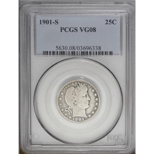 <B>1901-S<25C> VG8 PCGS.</B></I> With its low mintage and even lower survival rate, the '01-S is the undisputed key of the Barber quarter series and is highly sought after in all grades. This is a fully original piece that has light steel-gray surfaces that show deeper charcoal-gray accents around the devices. A conditionally rare specimen.