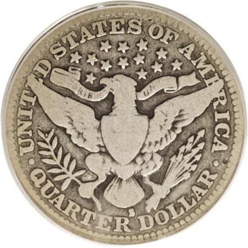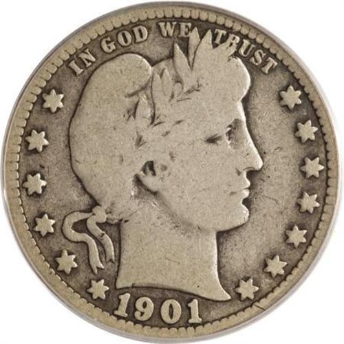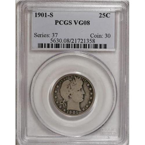 <B>1901-S 25C VG8 PCGS.</B></I> The 1901-S is the most desirable and sought after piece in the Barber quarter series. Unfortunately for collectors, this demand is at odds with the fact that this issue was heavily circulated in the channels of commerce. One only needs to peruse the PCGS/NGC population figures to verify this. Of the approximately 650 1901-S quarters certified to date by the two services, about 460 coins (71%) grade Poor to Good 6.<BR> The VG8 specimen offered in this lot displays natural medium gray patina in the fields that highlights the lighter silver-gray motifs. Both obverse and reverse exhibit full rims, somewhat stronger on the former, and portions of the dentilation are apparent on each. The L and Y of LIBERTY are clear, and the top of the T shows. The surfaces are remarkably clean for a moderate to heavily circulated coin, bearing far fewer marks than would be expected for the VG8 numerical designation. In sum, this problem free key date will make a great addition to a low to mid-grade Barber quarter collection.<BR><BR><B>Coin Engraver:</B> Charles E. Barber<BR><BR><b>Shipping:</b> Coins & Currency (<a target="_blank" href="http://www.heritageauctions.com/common/shipping.php">view shipping information</a>)