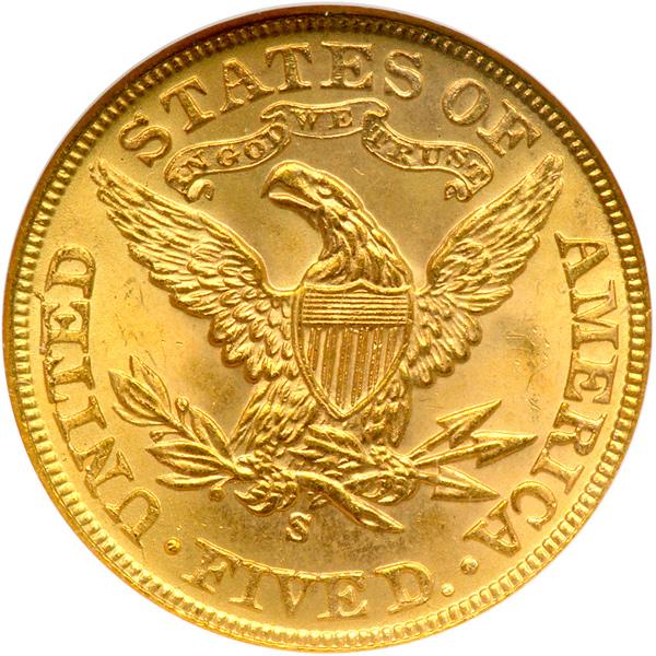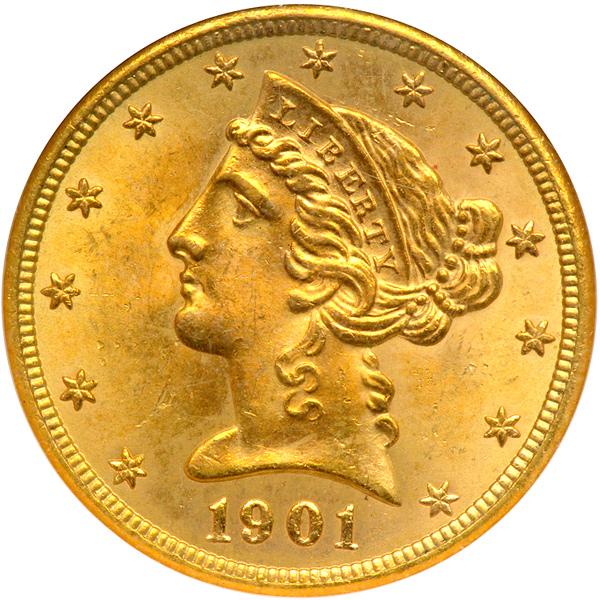 1901-S $5 Liberty. NGC graded MS-65. The surfaces glisten with sun-bright golden color that will make your head spin. In the period in which this coin was made, just after the turn of the 20th century, weak strikes were a thing of the past in the half eagle series. That is why it is a pleasure to report a strike with preciseness everyone will admire. With the magic of perseverance, you too can acquire one of these handsome Gem BU Liberty half eagles (PCGS # 8404) .