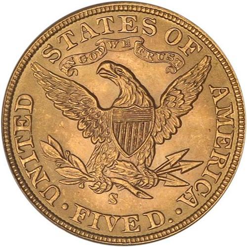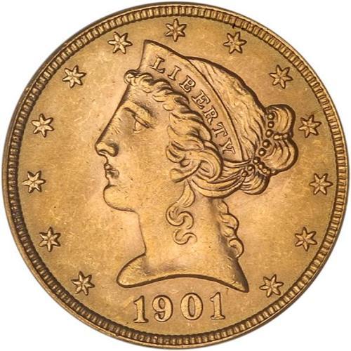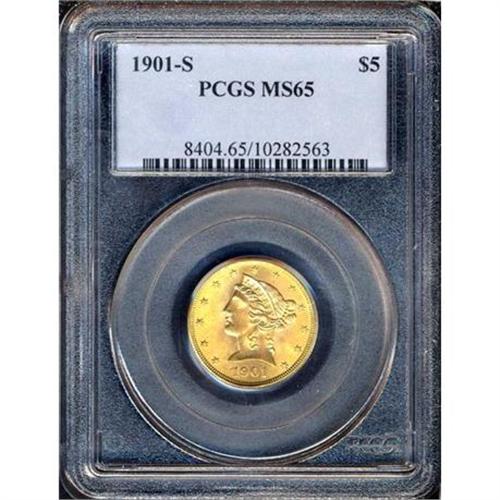 <b>1901-S $5 Liberty. PCGS graded MS65.</b> The frosty golden color is especially vibrant with this gemmy 1901-S, and so to the next qualification, the strike. Here we see razor-sharp detail with not even minor weakness to the sharp centers of Liberty and the eagle <b>(PCGS # 8404)</b> <i>