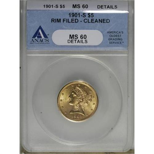 <B>1901-S $5 --Cleaned, Rim Filed--ANACS. MS60 Details.</B></I> NGC Census: (121/4594). PCGS Population (226/3823). Mintage: 3,648,000. Numismedia Wsl. Price for NGC/PCGS coin in MS60: $238. (#8404)<BR><BR><B>Coin Engraver:</B> Christian Gobrecht<BR><BR><b>Shipping:</b> Coins & Currency (<a target="_blank" href="http://www.heritageauctions.com/common/shipping.php">view shipping information</a>)