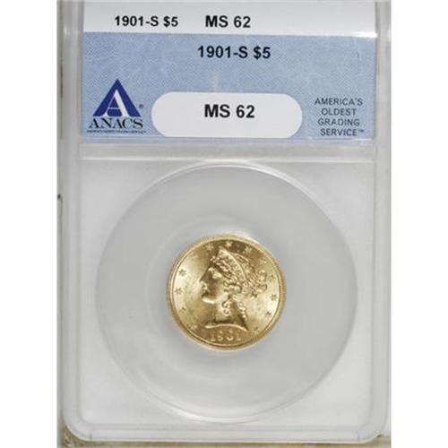 <B>1901-S $5 MS62 ANACS.</B></I> NGC Census: (1410/2339). PCGS Population (1164/2039). Mintage: 3,648,000. Numismedia Wsl. Price for NGC/PCGS coin in MS62: $300. (#8404)<BR><BR><B>Coin Engraver:</B> Christian Gobrecht<BR><BR><b>Shipping:</b> Coins & Currency (<a target="_blank" href="http://www.heritageauctions.com/common/shipping.php">view shipping information</a>)