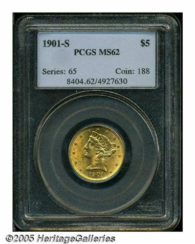 <B>1901-S<$5> MS62 PCGS.</B></I> This is an ideal coin for the type collector, being one of the most plentiful Liberty Head Half Eagles, and perhaps the single most common San Francisco Mint issue. It is a sharply struck example with lightly abraded surfaces, yet with a full complement of frosty yellow luster.
