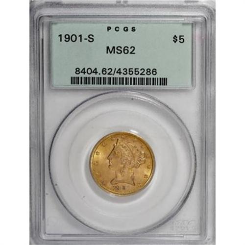 <B>1901-S $5 MS62 PCGS.</B></I> PCGS Population (1142/1964). NGC Census: (1368/2298). Mintage: 3,648,000. Numismedia Wsl. Price for NGC/PCGS coin in MS62: $265. (#8404)<BR><BR><B>Coin Engraver:</B> Christian Gobrecht<BR><BR><b>Shipping:</b> Coins & Currency (<a target="_blank" href="http://www.heritageauctions.com/common/shipping.php">view shipping information</a>\)