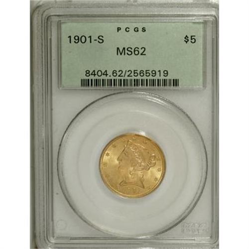 <B>1901-S $5 MS62 PCGS.</B></I> PCGS Population (1142/1964). NGC Census: (1368/2298). Mintage: 3,648,000. Numismedia Wsl. Price for NGC/PCGS coin in MS62: $265. (#8404)<BR><BR><B>Coin Engraver:</B> Christian Gobrecht<BR><BR><b>Shipping:</b> Coins & Currency (<a target="_blank" href="http://www.heritageauctions.com/common/shipping.php">view shipping information</a>)