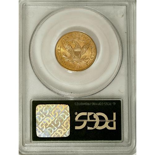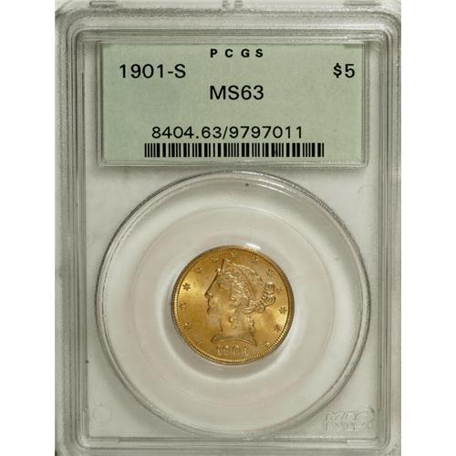 <B>1901-S $5 MS63 PCGS.</B></I> Housed in an older green-label PCGS holder, this Select Mint State piece is an attractive example for the grade. The surfaces have vivid lemon-yellow color with lighter pinkish-gold highlights.<BR><BR><b>Shipping:</b> Coins & Currency (<a target="_blank" href="http://www.heritageauctions.com/common/shipping.php">view shipping information</a>)