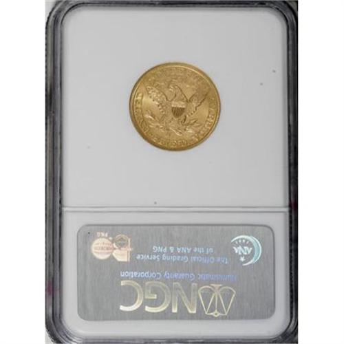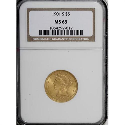 <B>1901-S $5 MS63 NGC.</B></I> NGC Census: (998/1300). PCGS Population (1060/904). Mintage: 3,648,000. Numismedia Wsl. Price for NGC/PCGS coin in MS63: $690. (#8404)<BR><BR><B>Coin Engraver:</B> Christian Gobrecht<BR><BR><b>Shipping:</b> Coins & Currency (<a target="_blank" href="http://www.heritageauctions.com/common/shipping.php">view shipping information</a>\)
