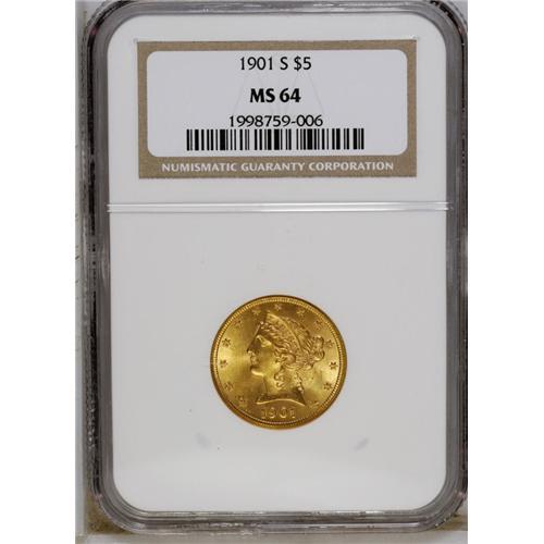 <B>1901-S $5 MS64 NGC.</B></I> Choice and crisply struck with strongly lustrous peach-gold surfaces. A small number of stray marks are noted in the obverse and reverse fields.<BR><BR><b>Shipping:</b> Coin/Currency (<a target="_blank" href="http://www.heritageauctions.com/common/shipping.php">view shipping information</a>)