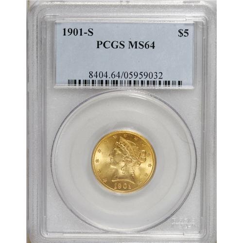 <B>1901-S $5 MS64 PCGS.</B></I> Great luster enlivens both sides of this attractive near-Gem, which is complemented by lovely peach-gold color. Sharply struck and minimally abraded. Probably the most common date of the series in most grades.<BR><BR><b>Shipping:</b> Coins & Currency (<a target="_blank" href="http://www.heritageauctions.com/common/shipping.php">view shipping information</a>)