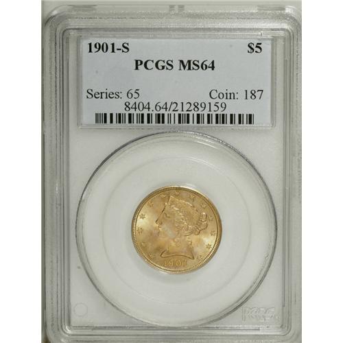 <B>1901-S $5 MS64 PCGS.</B></I> Steel-green and peach toning adorns the bright, satiny surfaces. Well struck except for a few of the stars, with a handful of small abrasions noted on the obverse. An appealing near-Gem example.<BR><BR><b>Shipping:</b> Coins & Currency (<a target="_blank" href="http://www.heritageauctions.com/common/shipping.php">view shipping information</a>)