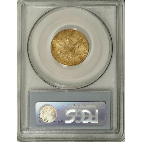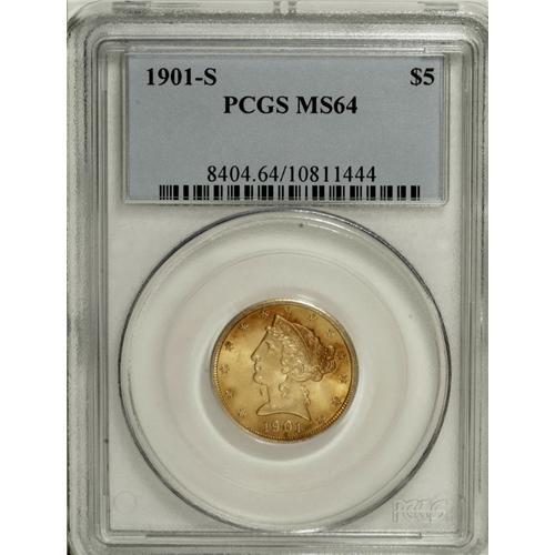 <B>1901-S $5 MS64 PCGS.</B></I> Warm yellow-gold with splashes of orange and a singular mint-green spot below the date. The strike is crisp, and the luster is powerful. At well over 3.6 million pieces struck, the 1901-S has the second-highest mintage for the denomination.<BR><BR><b>Shipping:</b> Coins & Currency (<a target="_blank" href="http://www.heritageauctions.com/common/shipping.php">view shipping information</a>)