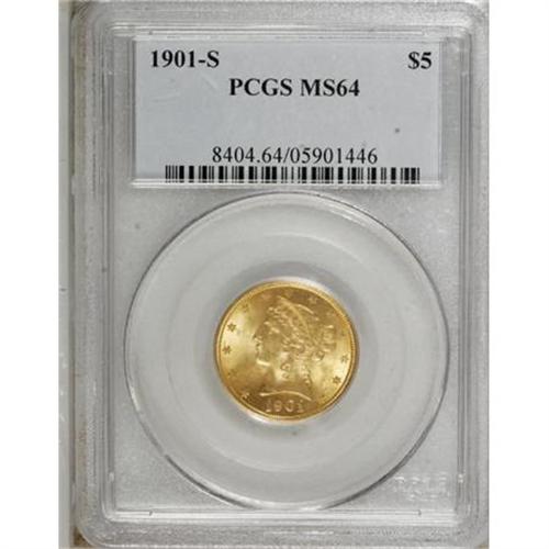 <B>1901-S $5 MS64 PCGS.</B></I> A solidly struck and highly lustrous representative of this turn-of-the-century San Francisco issue, primarily yellow-gold with elements of orange at the margins. A handful of small marks on each side combine to account for the grade.<BR><BR><B>Coin Engraver:</B> Christian Gobrecht<BR><BR><b>Shipping:</b> Coins & Currency (<a target="_blank" href="http://www.heritageauctions.com/common/shipping.php">view shipping information</a>)