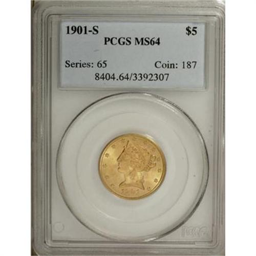 <B>1901-S $5 MS64 PCGS.</B></I> A few tiny surface marks on each side keep this frosty beauty from a Gem grade. It is an excellent type coin with frosty yellow and orange-gold luster.<BR><BR><B>Coin Engraver:</B> Christian Gobrecht<BR><BR><b>Shipping:</b> Coins & Currency (<a target="_blank" href="http://www.heritageauctions.com/common/shipping.php">view shipping information</a>)