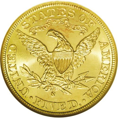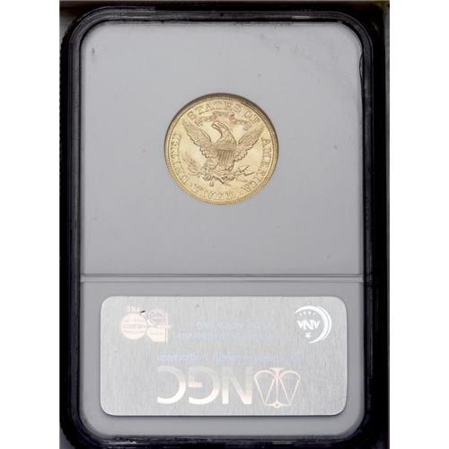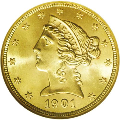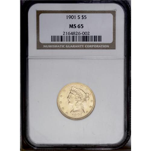 <B>1901-S<$5> MS65 NGC.</B></I> Frosty luster beams from the yellow-gold surfaces. Close examination with a loupe reveals only a bit of peripheral strike softness that left stars 6 through 10 without their central details fully brought up. Elsewhere the strike is as full as could be desired. There are only the tiniest of abrasions visible. Enormous eye appeal, and a beautiful S-mint type coin. Expected spirited bidding on this beauty! <BR><BR><B>Important notice:</B> Heritage usually auctions material at the rate of 200-250 lots per hour. On some occasions eBay Live bid software or the Internet may not be able to keep up with the pace of the auction. We recommend placing a realistic absentee bid now as insurance to avoid disappointment. Occasionally the auctioneer may eliminate or reject an eBay Live bid, and the auctioneer may also reopen a lot after the close of the eBay live bidding (usually because we missed an audience bid), and may reject your bid even if it shows you as the winning bidder. By bidding via eBay Live, you agree that Heritage may award the lot to another bidder at its sole discretion under the circumstances described above or any other reasonable circumstances. Since eBay bids are not shown to us until we open the lot on the floor, we treat those bids just like floor bids. In most cases the floor responds before the eBay bid is presented to us, due to Internet lag time, so for consistency we have made it a policy that floor bids are always considered first over tie eBay live bids. Also please note that all Heritage lots purchased through eBay Live carry a 20% Buyer's Premium. Please make sure you read the Terms and Conditions before you bid. This lot is being auctioned in conjunction with a live floor auction by Heritage Galleries & Auctioneers. All final auction and invoice information will be supplied by Heritage Galleries & Auctioneers, and all other information should be considered preliminary. Lot:2849 <BR><BR><B>Winning Notification and Billing:</B> After the FINAL session in this auction is complete, Heritage will send e-mail and snail mail invoices. This process normally takes several days. All final auction and invoice information will be supplied by Heritage Galleries & Auctioneers, and all other information should be considered preliminary. <BR><BR>This auction will be conducted on a live auction floor and over the Internet through eBay Live. If you choose to place an absentee bid, please take a moment to <font color='#0000ff'><u><a href='http://pages.ebay.com/liveauctions/help/before/laabsentee.html'>learn how eBay Live absentee bidding works</a></u></font><font color='#000000'>