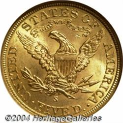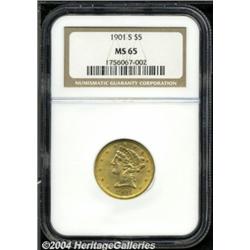 <B>1901-S<$5> MS65 NGC.</B></I> With swirling cartwheel luster, bold striking definition, and smooth surfaces, this green-golden Half Eagle has a very pleasant appearance. An ideal type coin selection. <BR><BR><B>Important notice:</B> Heritage usually auctions material at the rate of 200-250 lots per hour. On some occasions eBay Live bid software or the Internet may not be able to keep up with the pace of the auction. We recommend placing a realistic absentee bid now as insurance to avoid disappointment. Occasionally the auctioneer may eliminate or reject an eBay Live bid, and the auctioneer may also reopen a lot after the close of the eBay live bidding (usually because we missed an audience bid), and may reject your bid even if it shows you as the winning bidder. By bidding via eBay Live, you agree that Heritage may award the lot to another bidder at its sole discretion under the circumstances described above or any other reasonable circumstances. Since eBay bids are not shown to us until we open the lot on the floor, we treat those bids just like floor bids. In most cases the floor responds before the eBay bid is presented to us, due to Internet lag time, so for consistency we have made it a policy that floor bids are always considered first over tie eBay live bids. Also please note that all Heritage lots purchased through eBay Live carry a 20% Buyer's Premium. Please make sure you read the Terms and Conditions before you bid. </span></font></tr></table></td></tr></table>