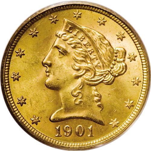 <B>1901-S $5 MS65 PCGS.</B></I> This is a remarkable Gem with brilliant yellow-gold surfaces and frosty luster. Both sides are sharply detailed and highly attractive. Although a high mintage issue and a common date in all lower grades, the '05-S half eagle is elusive in Gem grade, and only 36 finer pieces have been certified by PCGS.<BR><BR><b>Shipping:</b> Coins & Currency (<a target="_blank" href="http://www.heritageauctions.com/common/shipping.php">view shipping information</a>)