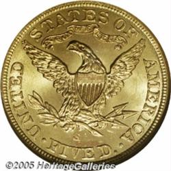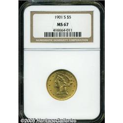 <B>1901-S $5 MS67 NGC.</B></I> A Superb type coin that is as attractive as any business strike Coronet five we can remember seeing for some time. A little softly defined on some of the stars, the surfaces have thick mint luster that show a touch of rose color on the highpoints with a pleasing green-gold elsewhere. There are just the tiniest breaks in the luster, no real bagmarks to speak of, just a few ripples in the mint bloom that keep the coin from absolute technical perfection. Population: 9 in 67, 1 finer (2/05).