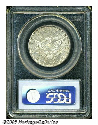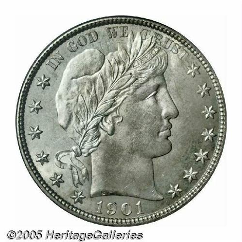 <B>1901-S<50C> MS65 PCGS.</B></I> Only 847,044 pieces were struck of the 1901-S half dollar. Writing in 1991, David Lawrence stated that he believed that the '01-S is the rarest Barber half in Mint State after the 1904-S and 1896-O. To date (5/05), only three other Gems have been graded by PCGS with five finer, and NGC has only certified two in MS65 with one finer. This is a well struck example that has soft mint frost that is overlaid with light patina on each side. Minimally abraded.
